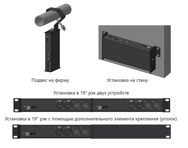 3. Варианты установки: настольный, крепление на стену, подвес на ферму, установка в 19" рэк.
